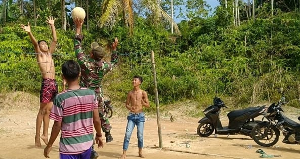 Untuk menjaga kesehatan warga desa binaan, Babinsa Koramil 19/BP Kodim 0204/DS Serda Safruddin bermain voli dengan pemuda Desa Bangun Purba, Kecamatan Bangun Purba, Kabupaten Deliserdang,